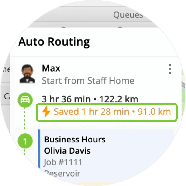 With a single click, the Auto Routing feature can optimise a staff member’s schedule for the day, saving time and fuel.